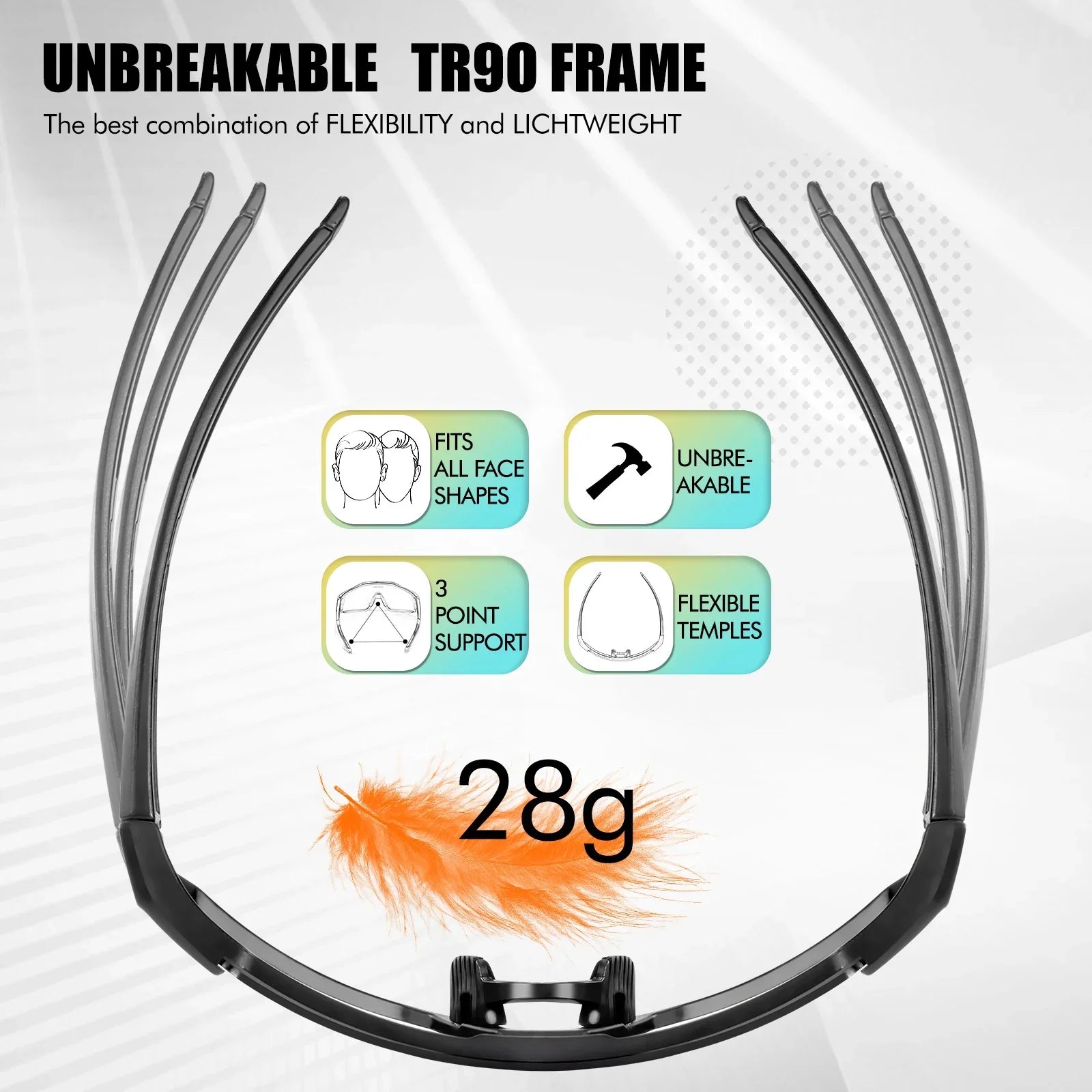 Hergestellt aus TR90 – einem Hightech-Material, das für seine Robustheit und Flexibilität bekannt ist – bieten diese Brillen außergewöhnliche Langlebigkeit bei einem extrem geringen Gewicht (nur 37 g). Sie sind bruchsicher, stoßfest, wasserabweisend und temperaturbeständig und somit für den dauerhaften Einsatz unter allen Bedingungen geeignet. Egal ob beim Laufen im Regen oder beim Radfahren in der prallen Sonne – diese Brille garantiert kompromisslosen Komfort.